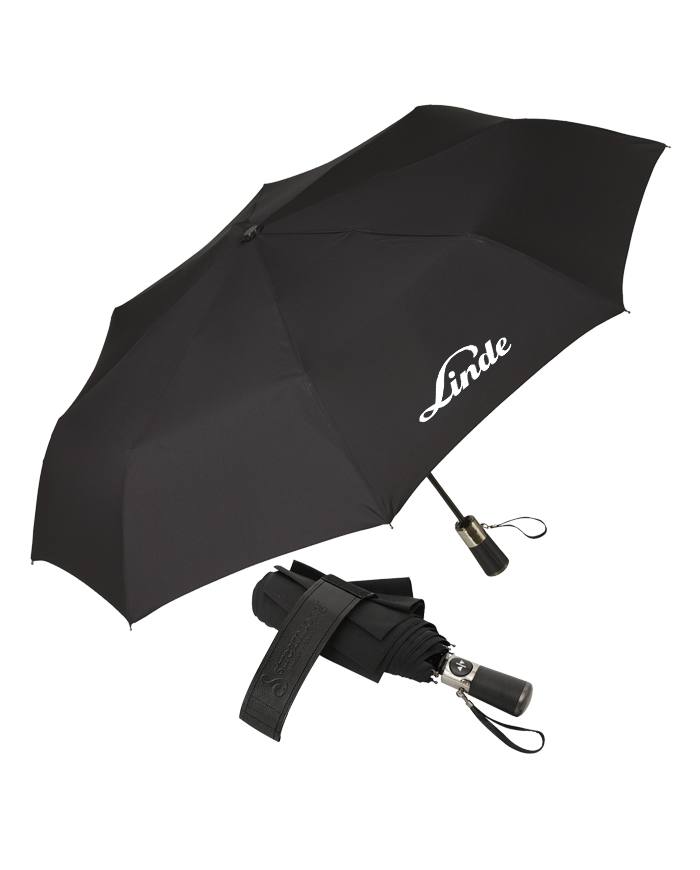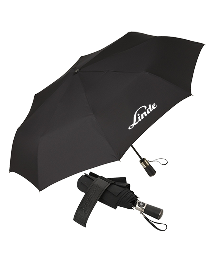 Black 42” Arc Mini Classic Umbrella, auto open and auto close – imprinted in white with Linde Worldmark Logo on one panel. Made with black RPET polyester and features a black leatherette handle, wide tie, 42" arc, one touch automatic open/close, black shaft and ribs and a matching sleeve. Folds closed and measures 12" when not in use.