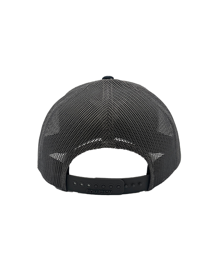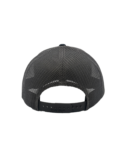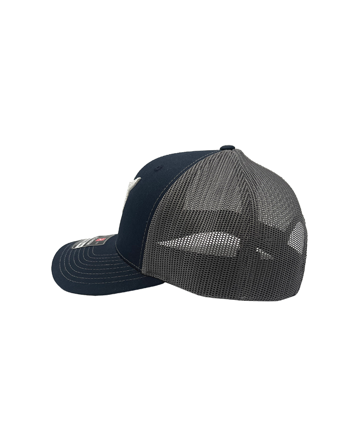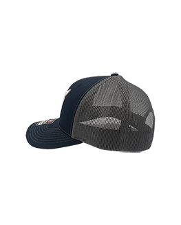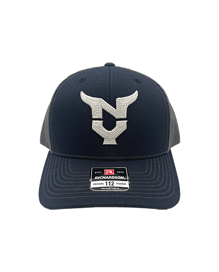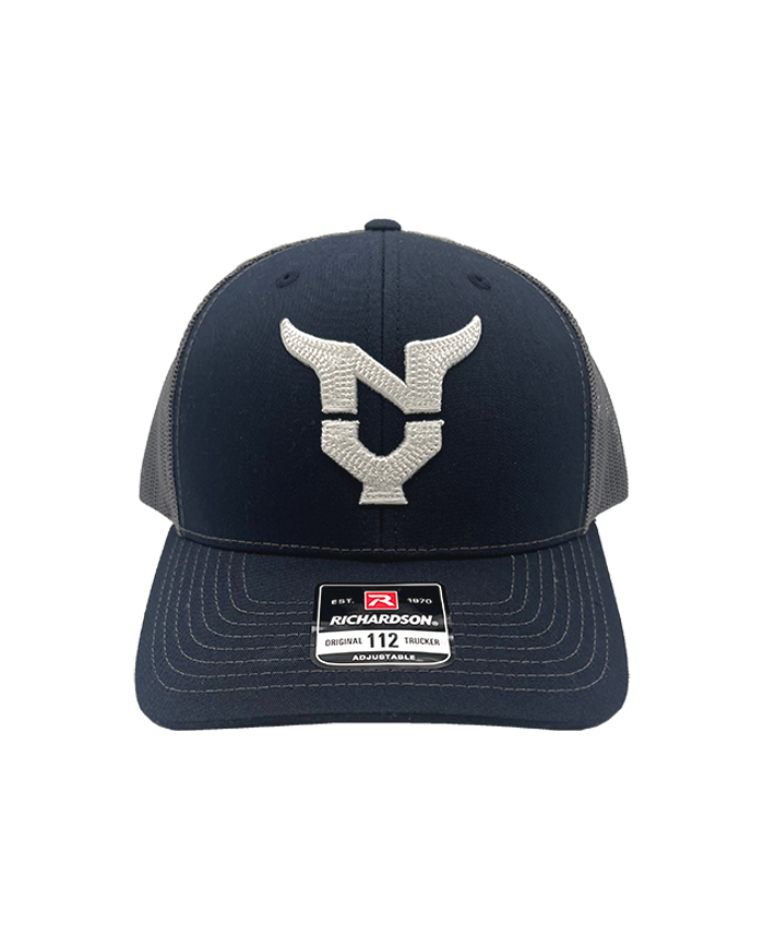 Navy/Charcoal Richardson trucker cap with chain stitch embroidery on the front of the NY logo.