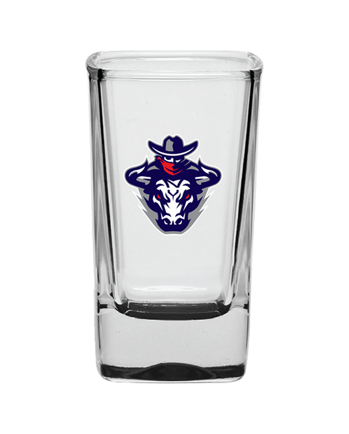 A square shaped shot glass printed on one side with the NY Maverick logo.