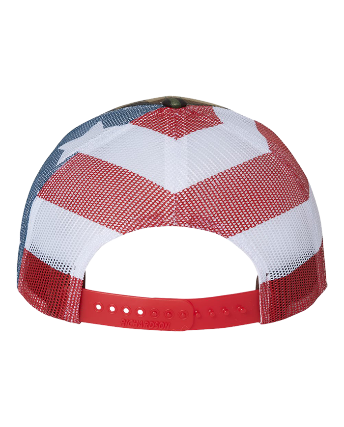 Richardson mesh trucker cap with a green camo front and an American Flag mesh back. Embroidered on the front with the Mavericks Crest logo.