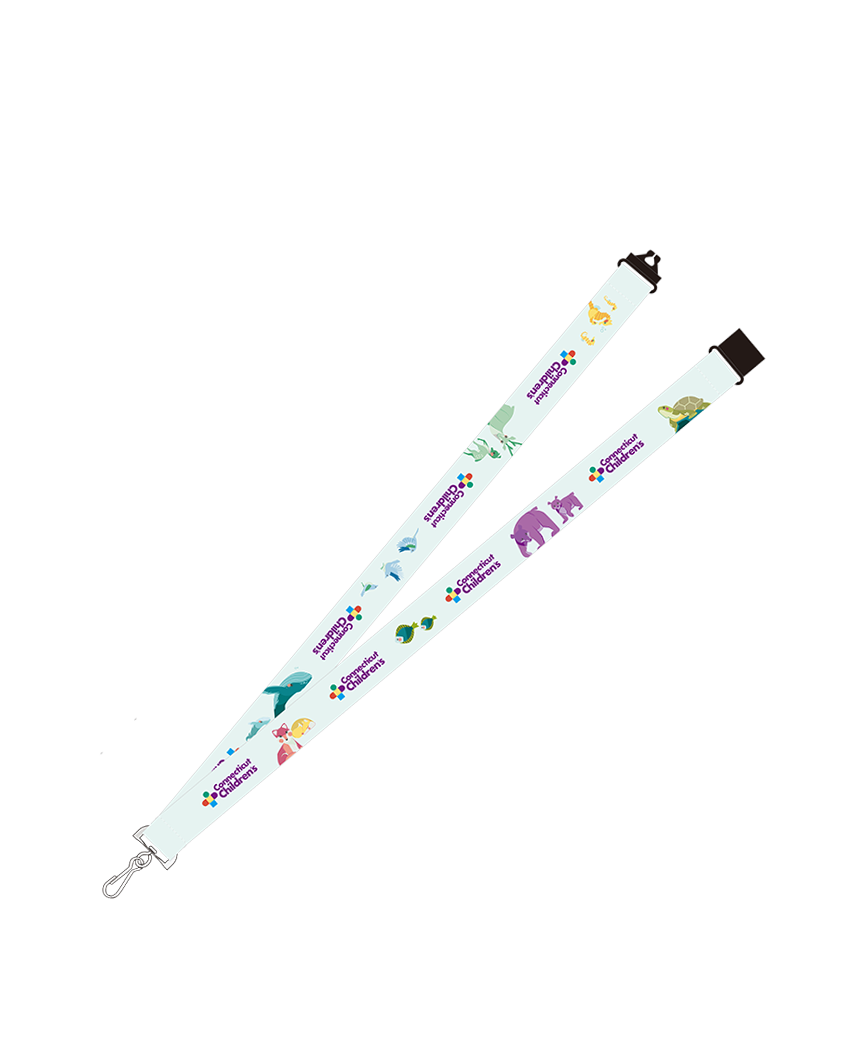 1" lanyard with featuring all our Wayfinding Friends with full color logo, neck release, and J-hook attachment.