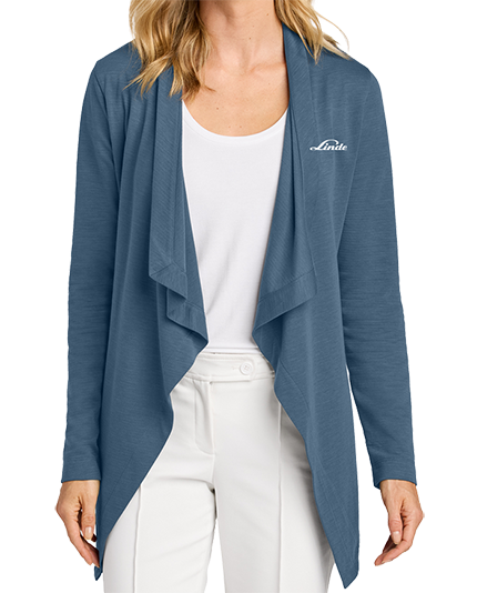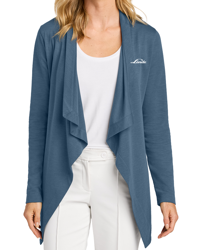 This crowd-pleasing cardigan, with its subtle slub texture, offers a carefree layering option for the office or any casual setting. 60/40 COTTON/POLYESTER, Open front, shawl collar with waterfall lapels, side seam pockets, elastic at waist for subtle shaping,