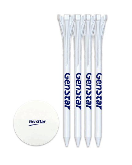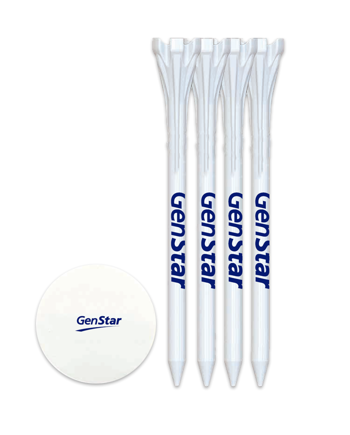 4 3-¼” tees and a plastic ball marker in a polybag.