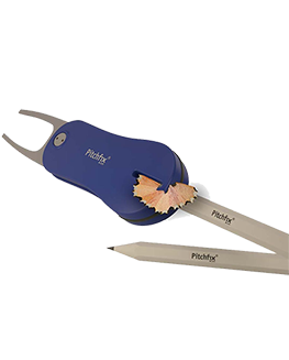 The Pitchfix Hybrid 2.0 Golf Divot Repair Tool is crafted from two aluminum sheets with a soft, rubberized ABS grip. Features switchblade function, ball marker and integrated pencil sharpener. Blue with Genesis logo printed on ball maker.