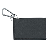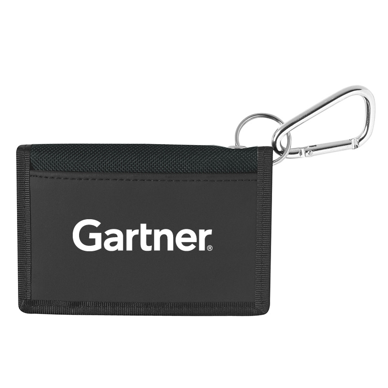 This folding ID wallet has an outside front pocket, inside clear window, split ring and carabiner attachment. In addition, the wallet has an inside pocket, a zippered pocket and a hook and loop closure. Printed with the Gartner logo on one side.