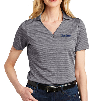 This Polo shirt has a subtle stripe and key-hole collar. Gartner embroidered on the left chest. Made from 100% polyester jersey, a snag resistant and moisture wicking fabric.