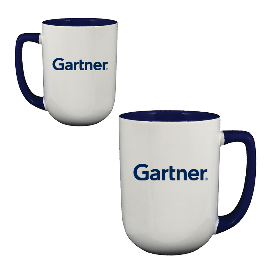 A 17 oz. white ceramic mug with a blue accent comfort handle and blue interior. Printed on both sides with the Gartner logo. Handwashing recommended.