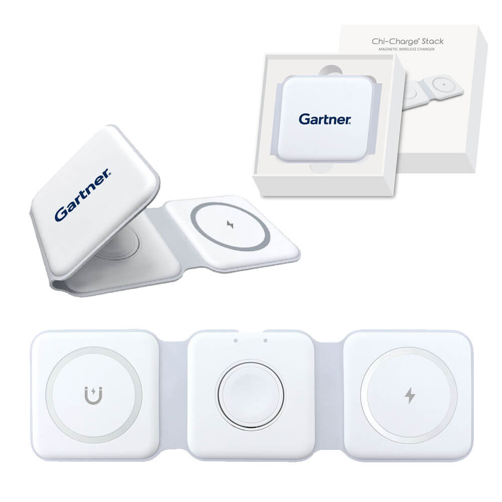 Charging multiple devices at once, just got easier! This super compact device will wirelessly charge your compatible phone, watch and earbuds case at the same time. The charger lays flat or can be stacked and folded. When flat, the charger is 9.7. Folded it is 9.7 x 2.9 x 0.3. Consists of a mobile phone (5W)/AirPods (3W) pad, magnetic Apple Watch charger and mobile phone magnetic fast charging pad (15W). Included in the box is a 3-In-1 wireless charging pad, USB-C charging cable and manual.