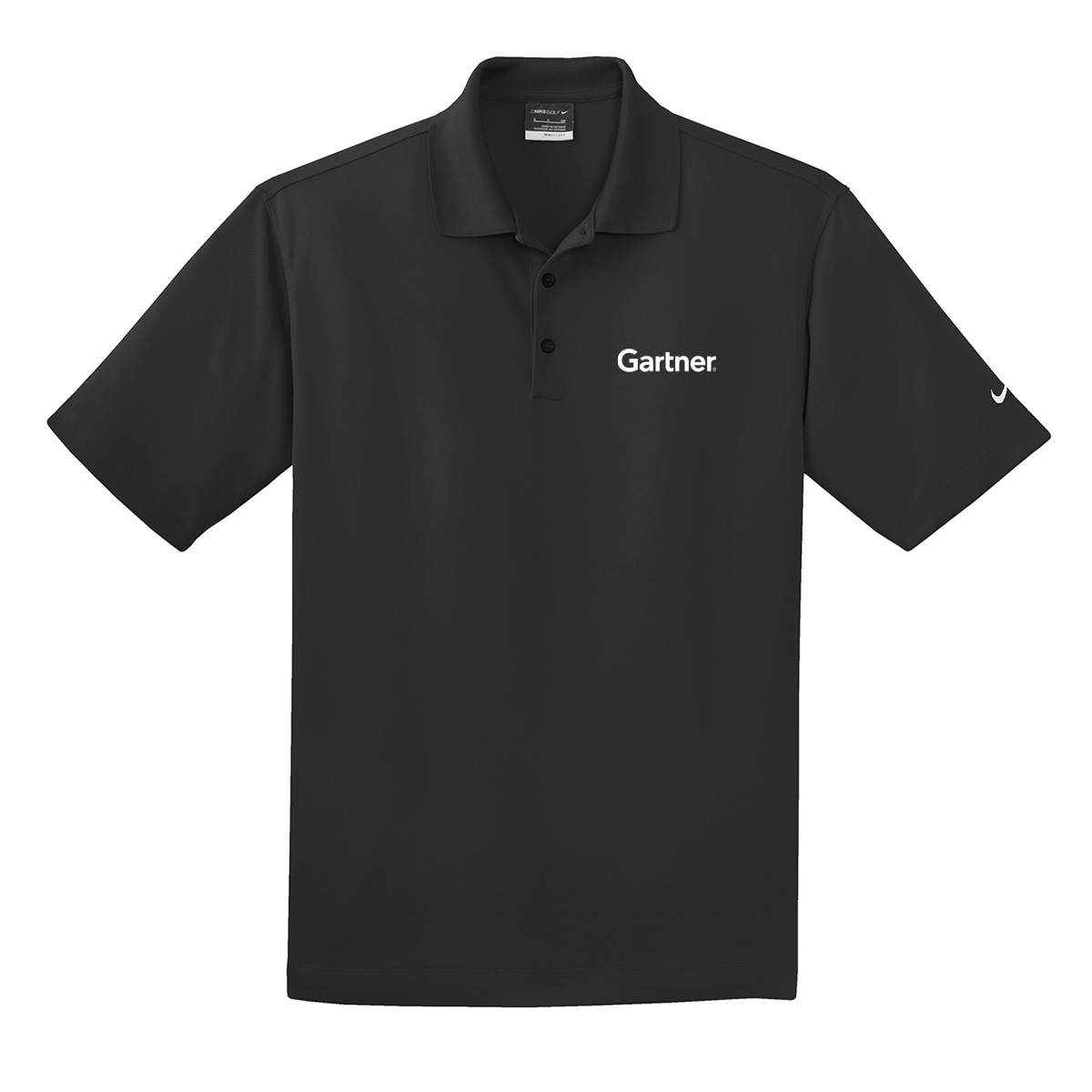 Nike Golf Dri-Fit black polo shirt with knit collar, three button placket and open hem sleeves. The Nike Swoosh is on the left sleeve and the Gartner logo embroidered in white on the left chest. Men’s shirt made from 4.4 ounce polyester.