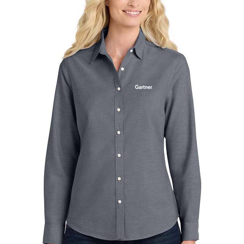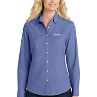 Ladies long sleeve oxford shirt embroidered with the Gartner logo in white on the left chest. This stain resistant, soft hand, cotton/poly shirt has an open collar, front darts, back yoke with pleats, two-button adjustable cuffs and a wrinkle free finish.