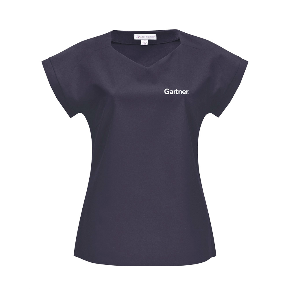 A ladies 92% polyester / 8% spandex V-neck blouse with cuffed sleeves, bust darts and a sounded sweep. This navy blue shirt is embroidered on the left chest in white with the Gartner logo and is perfect for trade shows, events and everyday office wear!