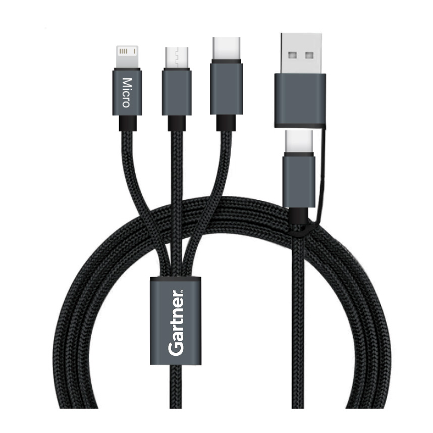 A braided and durable 5' charging cable with a Type-C input, USB input adapter and three output connectors for simultaneous charging of all three outputs: micro USB, Type-C and lightning. Engraved with the Gartner logo.