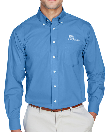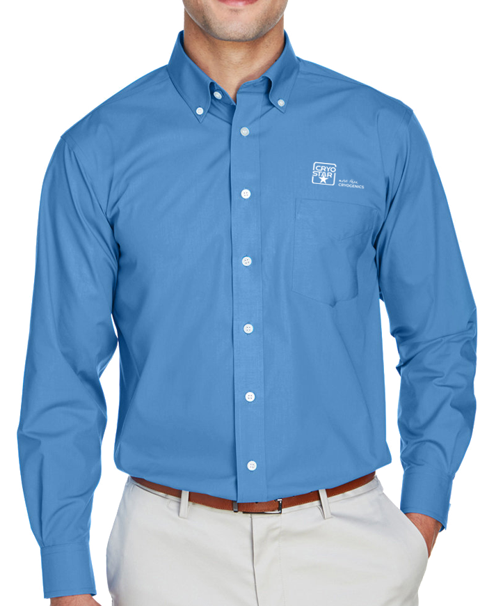 3.4 oz., 55% cotton, 45% polyester broadcloth, Patented pucker-free taped seams; Classic fit for professional appearance; Rolled button-down collar; Adjustable "Comfort Collar" gives up to an inch stretch at neck; Left-chest pocket; non-iron performance straight from the dryer.