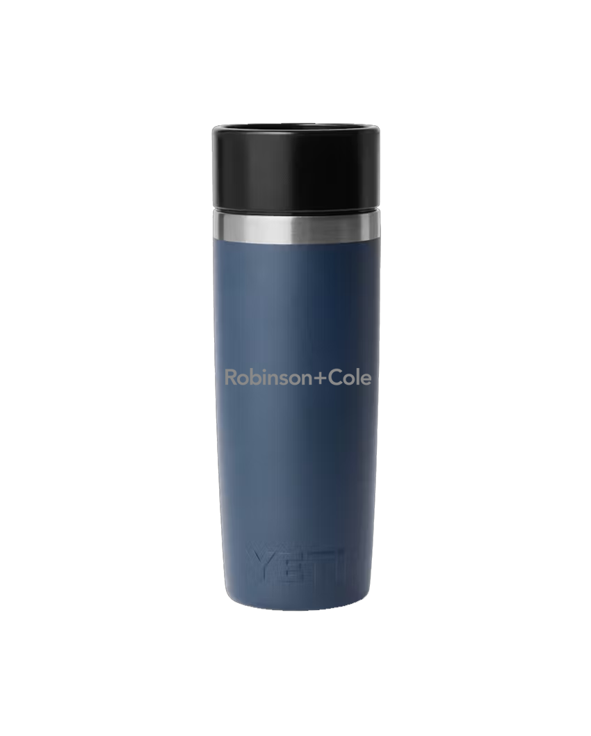A 16 oz. navy blue Yeti travel bottle with a commuter cap. The bottle is cup holder compatible, with a 360 drinking experience and a 100% leakproof lid. Dishwasher safe, the bottle is engraved on one side with the Robinson & Cole logo.