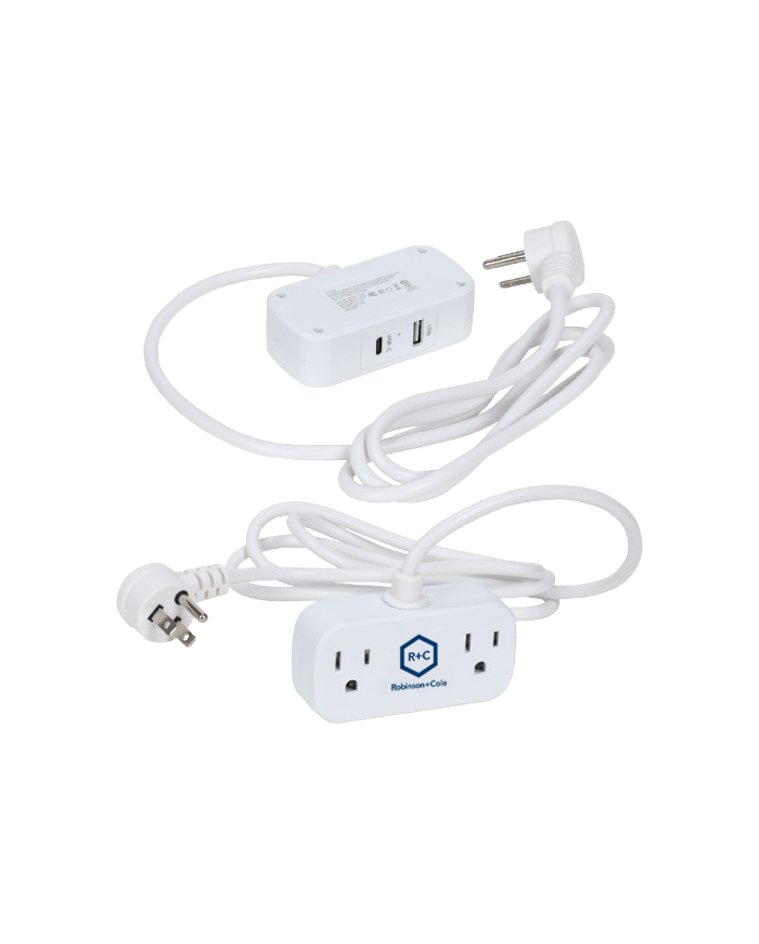 A wall charger power strip with a 5-foot cord, two AC outlets and two DC outlets. With USB and USB-C ports on the side, this is the perfect item for both home and office use! The strip has surge protection, short circuit, over voltage and over current protection and an ABS&PC fireproof shell. ETL listed and FCC certified. Printed with the Robinson & Cole logo.