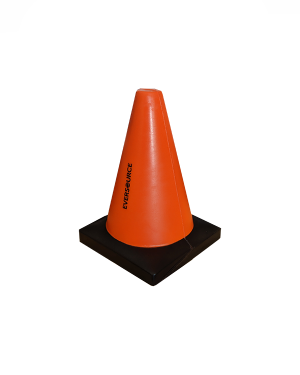 Orange cone with black bottom with Eversource logo in black.