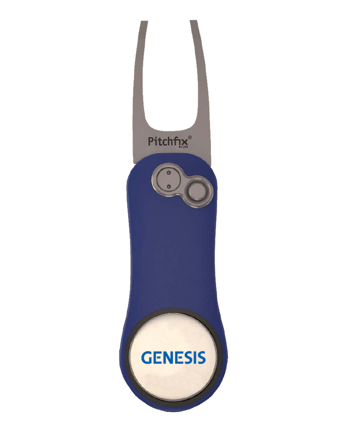 The Pitchfix Hybrid 2.0 Golf Divot Repair Tool is crafted from two aluminum sheets with a soft, rubberized ABS grip. Features switchblade function, ball marker and integrated pencil sharpener. Blue with Genesis logo printed on ball maker.