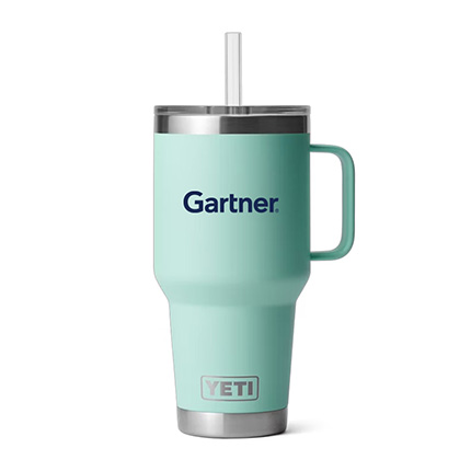 A cup holder friendly 25 oz Yeti mug with a wide straw that handles everything from smoothies to all-day iced coffee. The tumbler is double wall insulated and printed in blue with the Gartner logo.