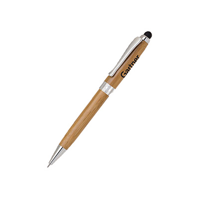 This twist action eco-friendly bamboo pen has chrome accents and a stylus tip. Printed in black with the Gartner logo.