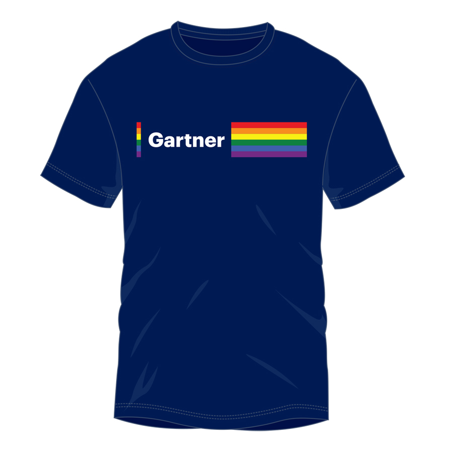 Gartner stands with the LGBTQ community! Show your PRIDE with this soft-touch navy-blue T-shirt with a rainbow and Gartner name printed on the front. Please email
