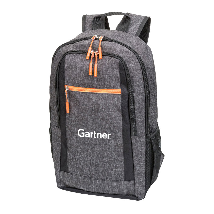 Computer backpack with orange accents. A dedicated laptop pocket, three zippered pockets and wide mesh side pockets.