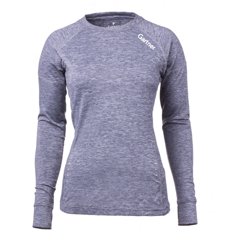 Fossa comfort poly/spandex long sleeve ladies crewneck t-shirt. Features include moisture wicking technology and UPF 30& protection. Available in blue or gray. Gartner logo is lasered under the left shoulder on the blue shirts. The gray shirts are printed in White under left shoulder.