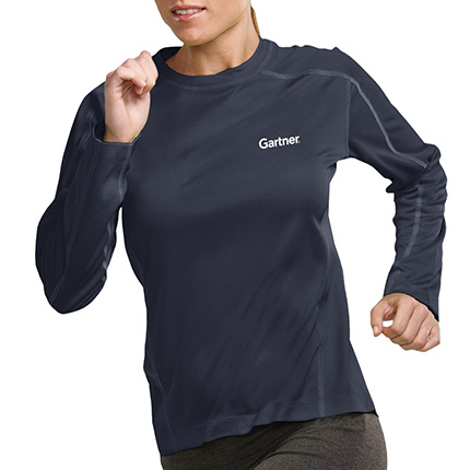 Ladies 100% polyester jacquard long sleeve shirt featuring Tri-Mountain UltraCool® moisture wicking technology. Contrast flatlock stitching reduces chafing and provides a sporty look. Crossover collar and media pocket on right side with the Gartner logo printed in white.