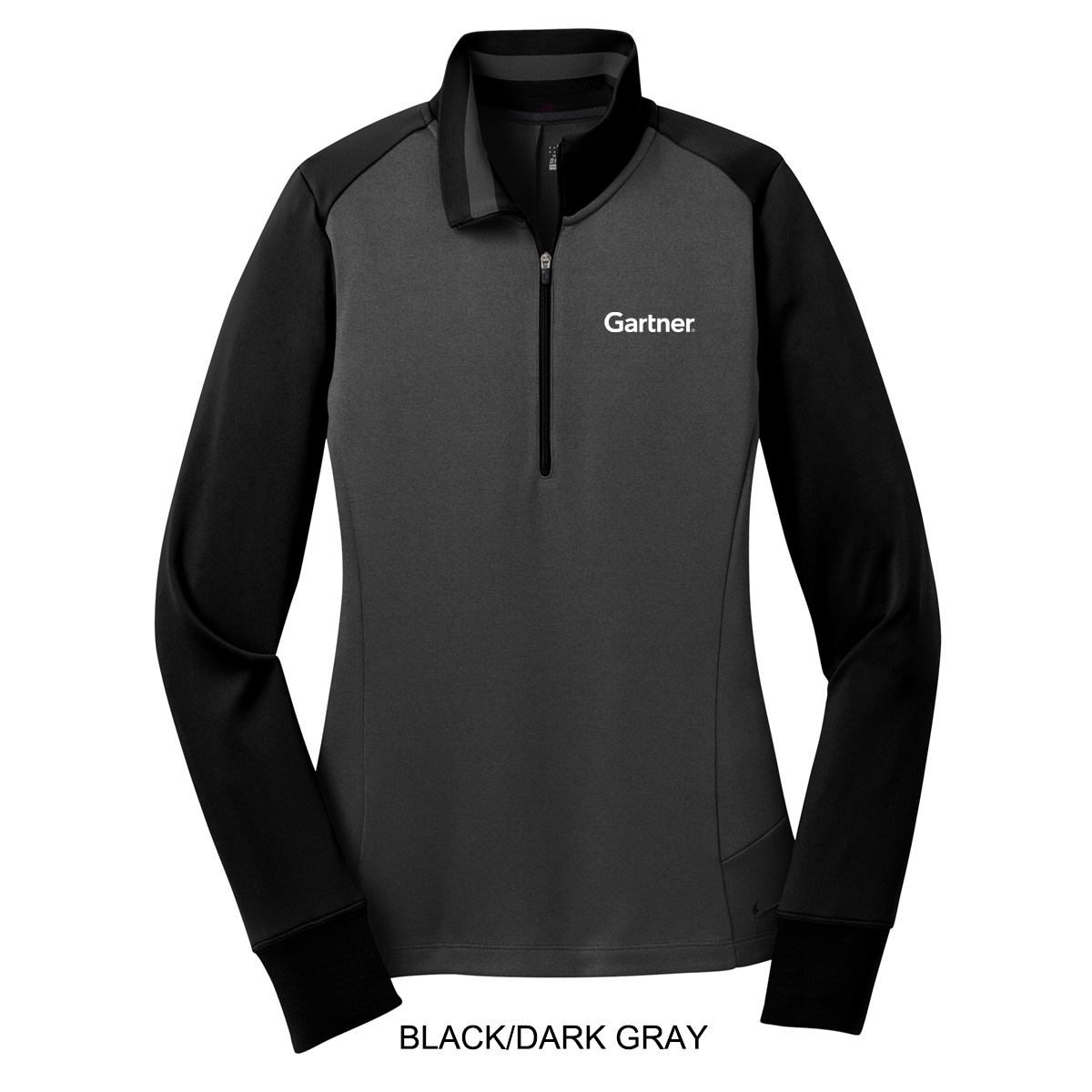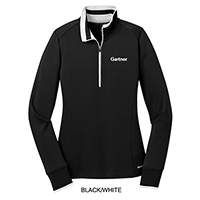 Ladies Nike Dri-Fit, moisture management, ½ zip pullover with the Gartner logo embroidered on the left chest in white. A boldly striped inner collar and reverse coil zipper give this cover-up an edge. The design features a flat knit collar and cuffs and an open hem. Tailored for a feminine fit with shaped sleeve cuffs and a drop tail hem. The contrast Swoosh design trademark is embroidered on the left hem.