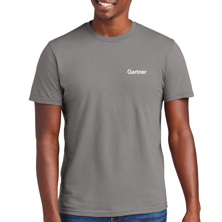 A District unisex soft touch rung spun cotton tee shirt printed on the left chest in white with the Gartner logo. Has a slightly slimmer body and shorter sleeves.