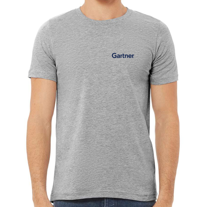 A unisex Bella & Canvas tee shirt with a retail fit, side seams, tear away label and the Gartner logo printed on the left chest in blue. Sustainably produced with 52% cotton/48% polyester.