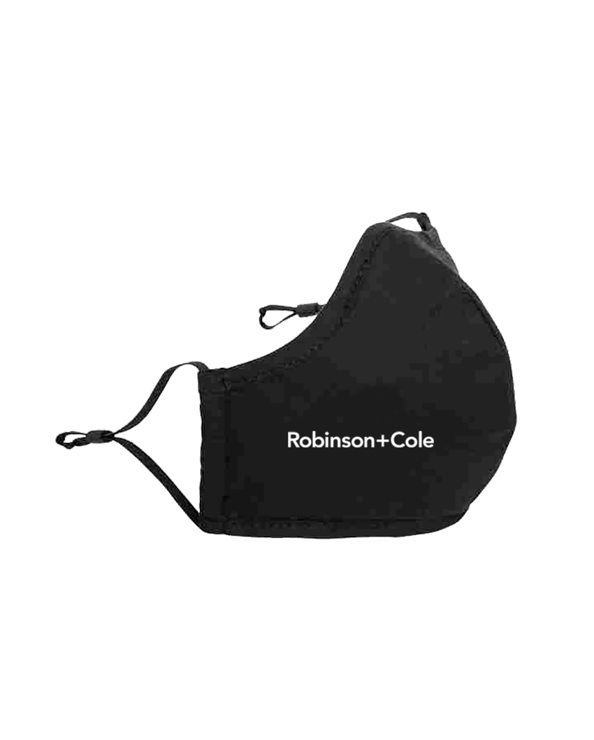 A two layer reusable face mask with a cotton outer layer and a poly/spandex inner. Has an integrated metal nose frame to ensure a proper fit, an interior filter pocket and elastic straps with an adjustable toggle. One size fits most. Printed with the Robinson & Cole logo. Filter not included.