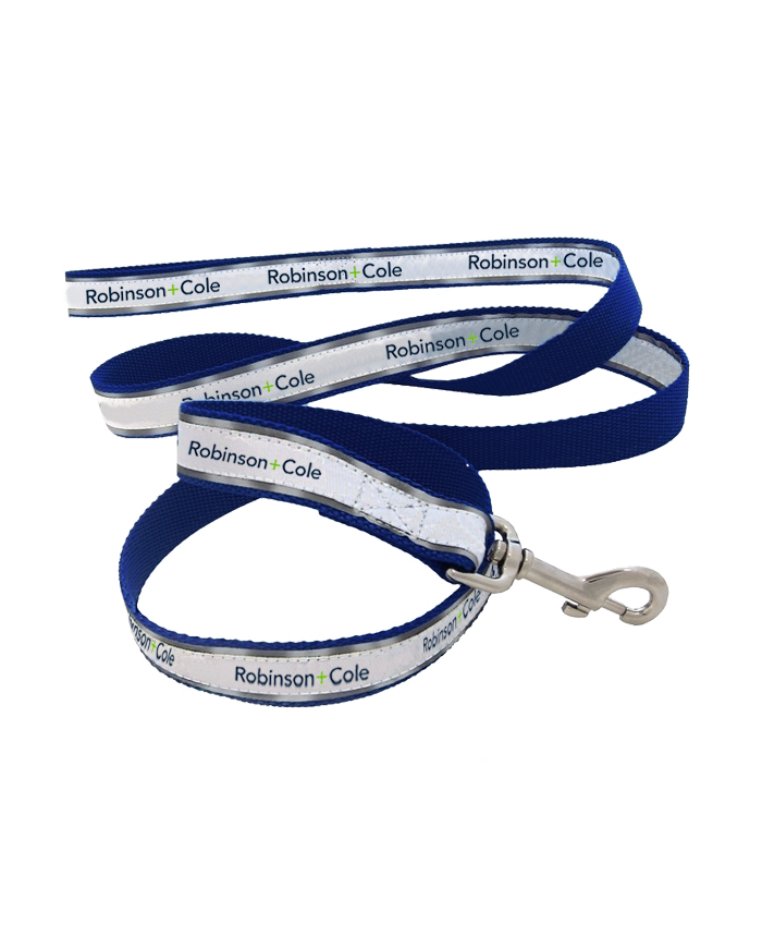 Reflective pet leash with heavy duty hardware and printed with the Robinson & Cole logo. 72 L x 1 W.